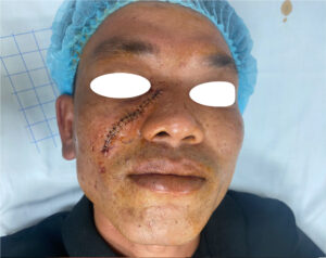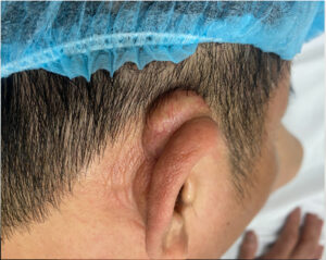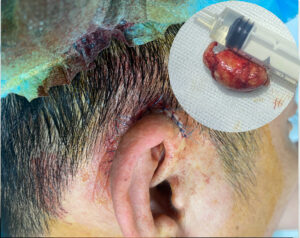 | Hình 5: Bệnh nhân tái phát u nang bì lần 2 sau phẫu thuật tại 2 cơ sở y tế khác | Hình 6: Bệnh nhân phẫu thuật bóc trọn khối u nang bì |