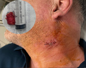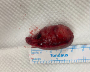 | Hình 7: Bệnh nhân tái phát u nang bì sau phẫu thuật tại Canada | Hình 8: Khối u nang bì được phẫu thuật lấy trọn. |