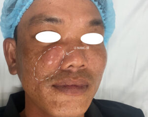 | Hình 1: Khối u nang biểu bì dưới da # 2-3 năm, kích thước to dần ảnh hưởng thẩm mỹ bệnh nhân. | Hình 2: Khối u nang biểu bì đã được phẫu thuật. | Hình 3: Khối u nang biểu bì bệnh nhân được bóc tách |